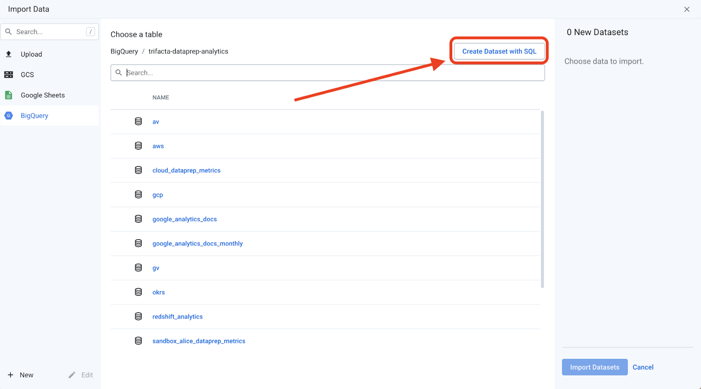 From the “Import Data” page, select your source system on the left, and then click the “Create Dataset with SQL” button at the top of the screen.