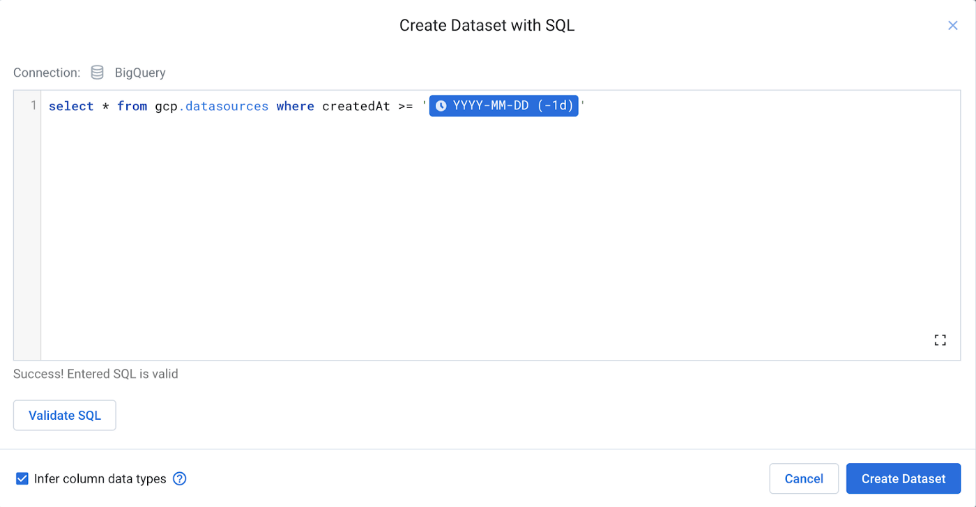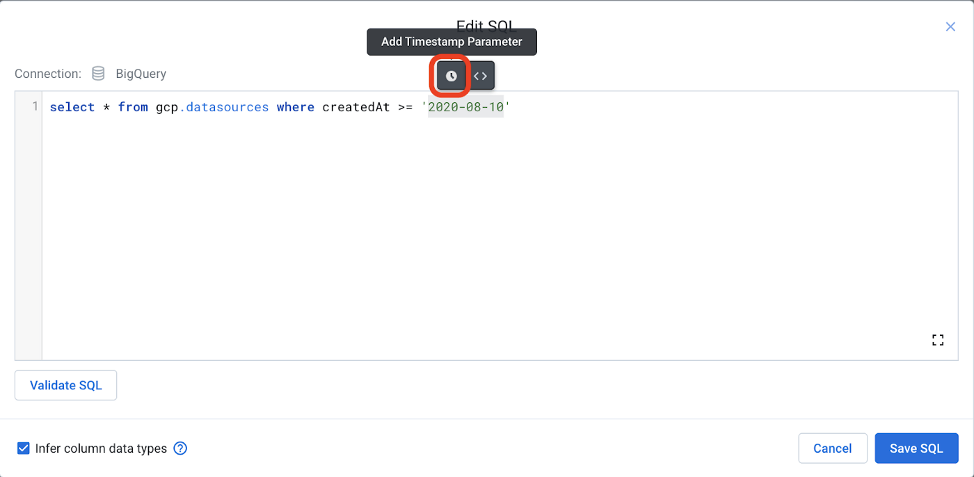 Click “Save” on the pop-up to store your parameter settings. After you save your parameter, your custom SQL statement will include a dark blue bubble. This represents your dynamic timestamp parameter.