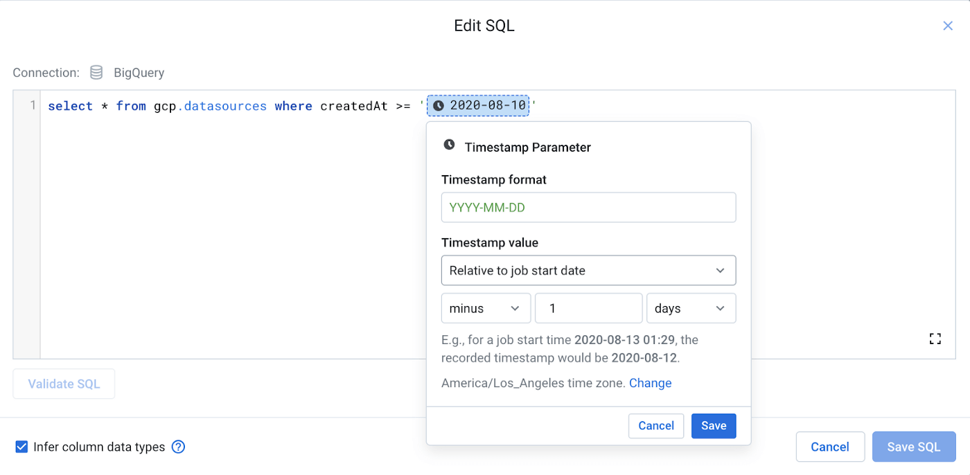 For example, if a job that uses this custom SQL dataset as a source is executed on August 14, 2020, and the “Timestamp value” is set to “Relative to job start date minus 1 days”, Designer Cloud will populate the SQL statement with the string value “2020–08–13”.