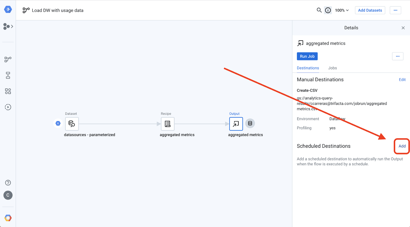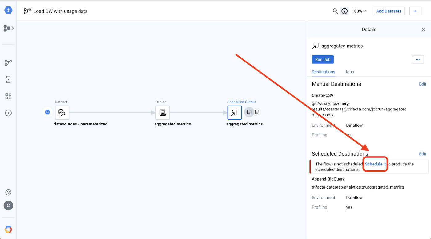 Finally, you’re ready to schedule your flow and incremental load. From the output details panel, click the “Schedule it” hyperlink to configure the cadence at which Designer Cloud will execute your job.