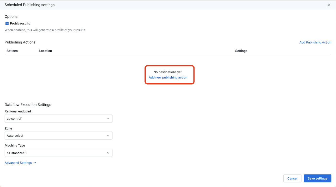 This will open the “Scheduled Publishing settings” page. Click the hyperlink in the middle of the page that reads “Add new publishing action” to configure your output settings.