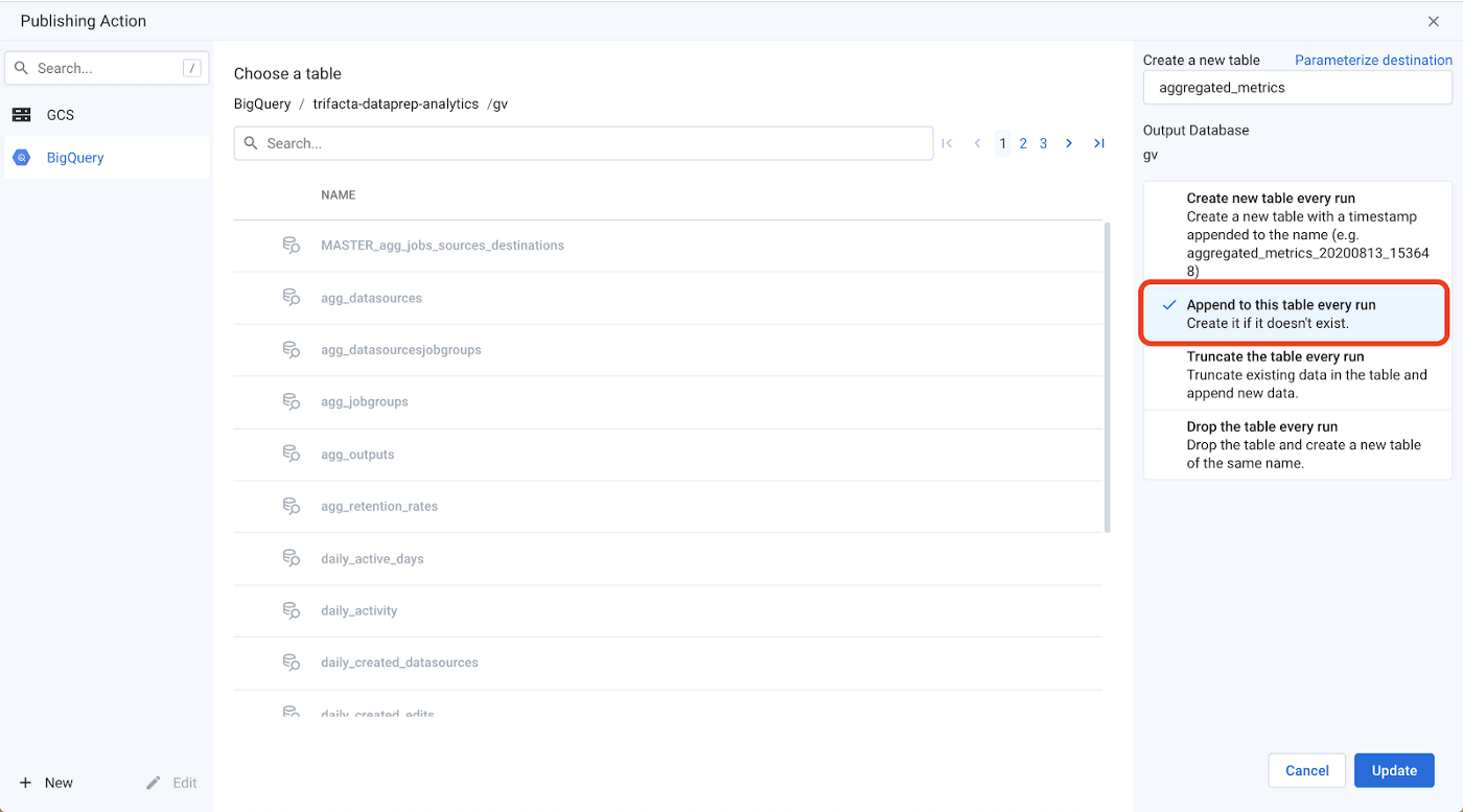 From the publishing settings page, navigate to your data warehouse and click “Create new table”. You can configure the name of the table that you are going to be creating. When performing an incremental load, we recommend selecting the “Append to this table every run” option. This ensures that whenever your job executes, Designer Cloud will write the newly processed records to the bottom of your existing table.