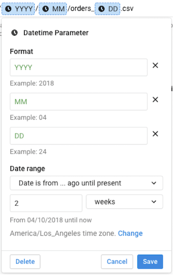 Datetime parameters let data engineers point out dates or times in their file paths and define rolling ranges that Designer Cloud will dynamically resolve at job run time. This lets them do valuable things like match the last two weeks of files partitioned by date (e.g. 2018/04/orders_25.csv).