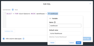 Designer Cloud’s custom SQL editor already provides a powerful way for those data engineers that are comfortable writing SQL to select exactly the right data. They can select columns, filter their data, pre aggregate, create calculated fields, and join with other tables in their database all before bringing their data into Designer Cloud to wrangle. We’re making it even better by letting them use variables in their r SQL statements. Data Engineers can replace as much or as little of their SQL statement as they want with a variable.