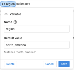 Variables let data engineers define a part of a path that they’ll have the ability to override later on when running a job, setting up a schedule, or invoking Designer Cloud’s APIs.