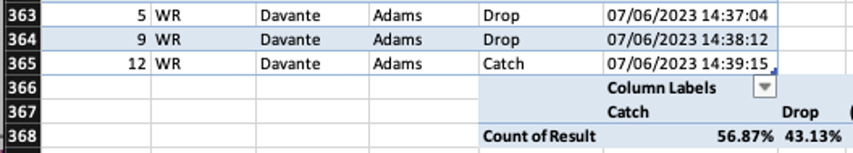 Using this method, I ran over 350 plays simulating catch or drop for these two players. My ‘virtual’ catch percentage for Da’Vante Adams was 56.8%. I then looked up Da’Vante Adam’s real-world catch percentage from the 2022 season, which was 55.6%. Incredible. Adding the randomness of the dice roll and modifiers enabled me very accurately model Da’Vante Adam’s catch percentage for an entire season.