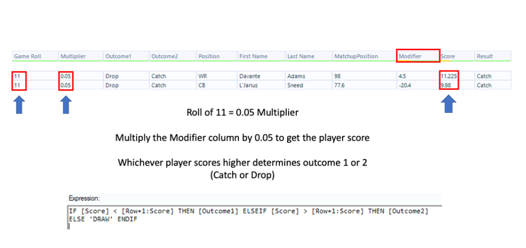 What’s important to note here is the ‘multiplier’ column. This will determine the encounter’s outcome by multiplying that number against player ratings mismatch. For example, if the Wide Receiver has a catch score of 95, and the defender has a defend score of 70, then the encounter is -25 points in favor of the Wide Receiver. But, if the dice roll is 3, and you multiply that -25 by -1, then the defender’s disadvantage becomes a +25 point advantage, meaning they will successfully defend the pass. But rolling a 3 is very hard, so it won’t happen often, which is how we account for those ‘rare’ moments. Notice the more common numbers like 10 and 11; it’s more even and favored toward the receiver.