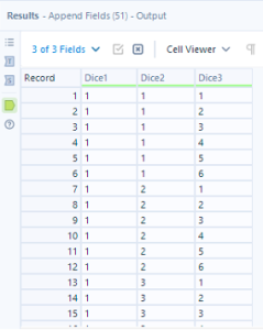 First, create a three-dice roller. You can start with this community challenge. The workflow abbreviates the dice roller as ‘3d6’, meaning three dice are rolled with 6 sides. Add three text input tools with numbers 1-6 to represent an individual die. Then we append all fields together: